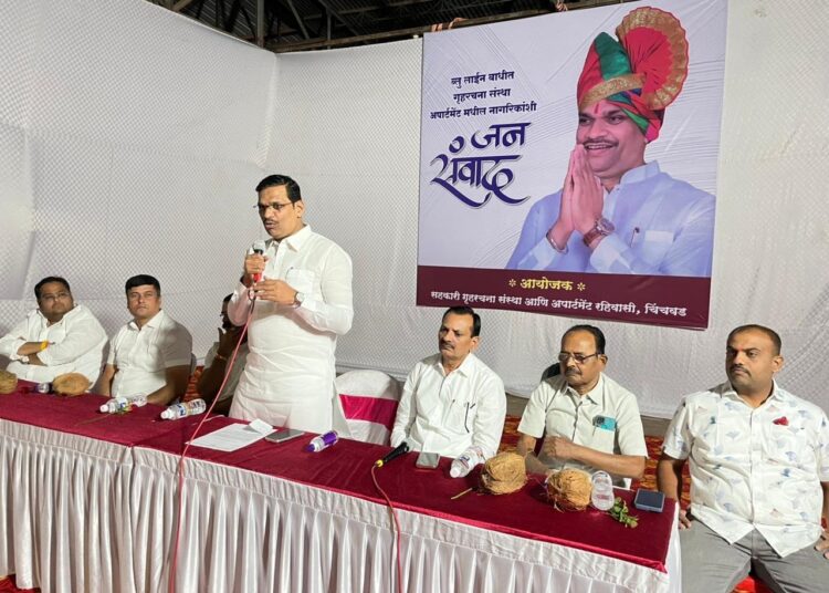 चिंचवड येथे रविवारी (दि. ९) निळी पूररेषा बाधित गृहरचना संस्था, अपार्टमेंट येथील नागरिकांच्या समस्यांबाबत मेळाव्याचे आयोजन करण्यात आले होते. त्यावेळी आमदार शंकर जगताप बोलत होते. यावेळी परिसरातील आजी माजी नगरसेवक, सोसायटीचे पदाधिकारी उपस्थित होते.