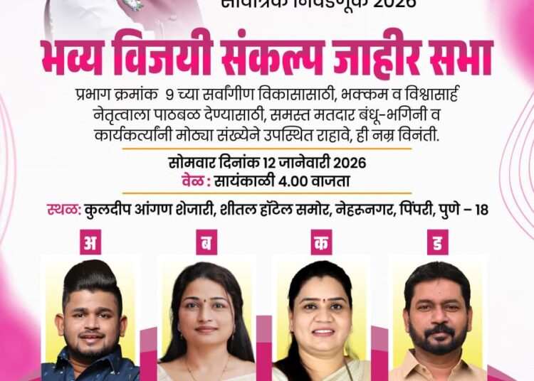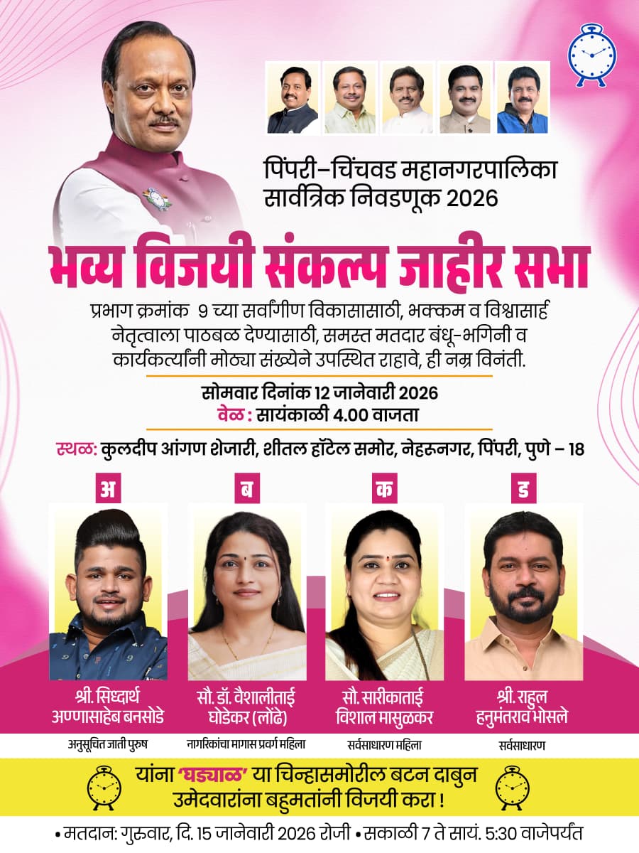 पिंपरी, पिंपरी–चिंचवड महापालिकेच्या निवडणुकीच्या पार्श्वभूमीवर प्रभाग क्रमांक ९ मध्ये राष्ट्रवादी काँग्रेसने प्रचाराची धार अधिक तीव्र केली आहे. या प्रभागातील राष्ट्रवादी काँग्रेसचे उमेदवार सिद्धार्थ बनसोडे, डॉ. वैशाली घोडेकर, सारिका मासुळकर आणि राहुल भोसले यांच्या प्रचारार्थ आज राष्ट्रवादी काँग्रेसची विजयी संकल्प सभा आयोजित करण्यात आली आहे.